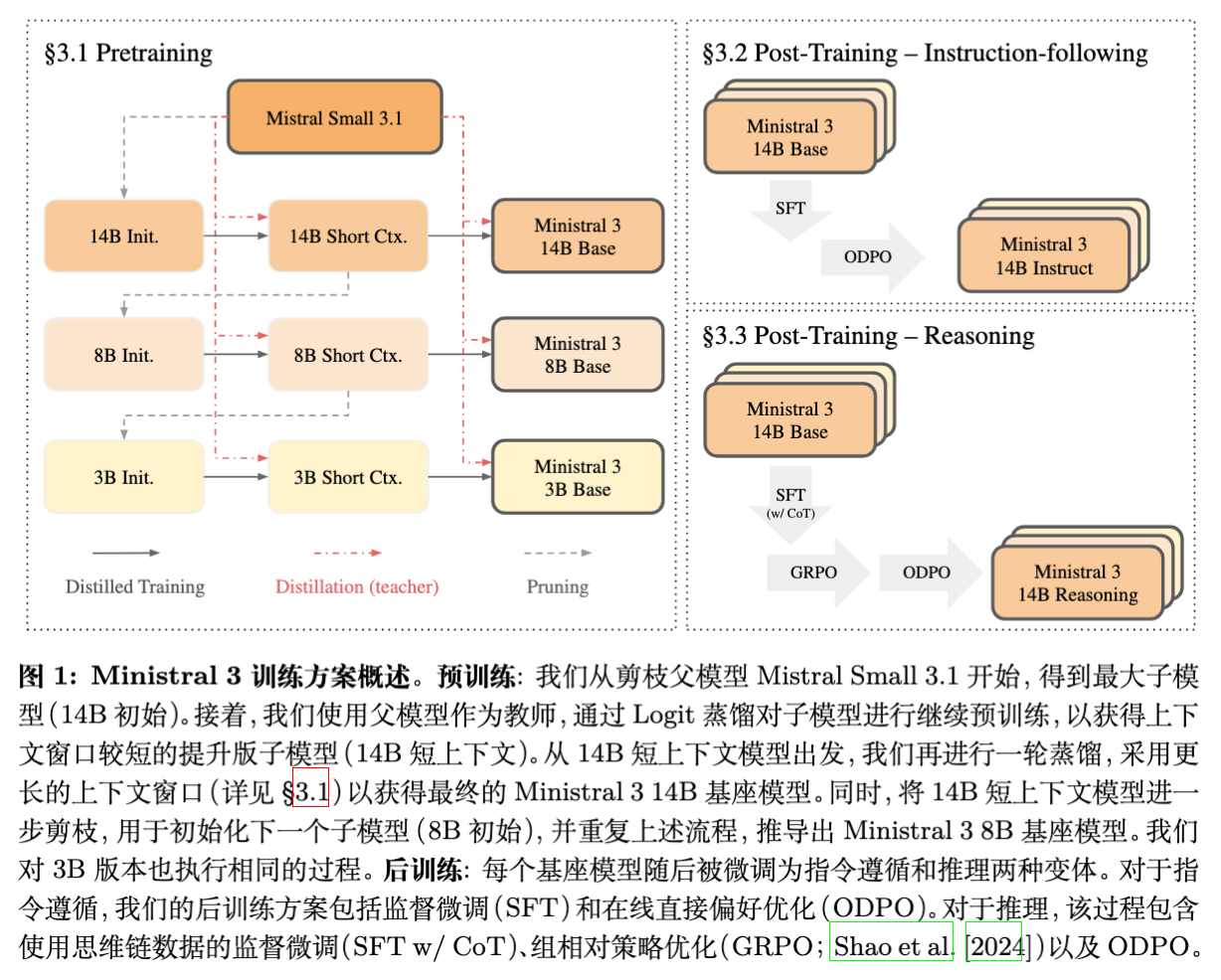 Mistral AI 近期发布了 Ministral 3 的技术报告,今天我们来解读一下。Ministral 3 系列包含 3B、8B 和 14B 三种参数规模,均提供 Base(基座)、Instruct(指令微调)和 Reasoning(推理)三个版本。该系列模型并未从零开始预训练,而是采用了一种被称为“级联蒸馏”(Cascade Distillation)的策略,从 Mistral Small 3.1(24B)这一父模型通过迭代式的剪枝(Pruning)和蒸馏(Distillation)获得。