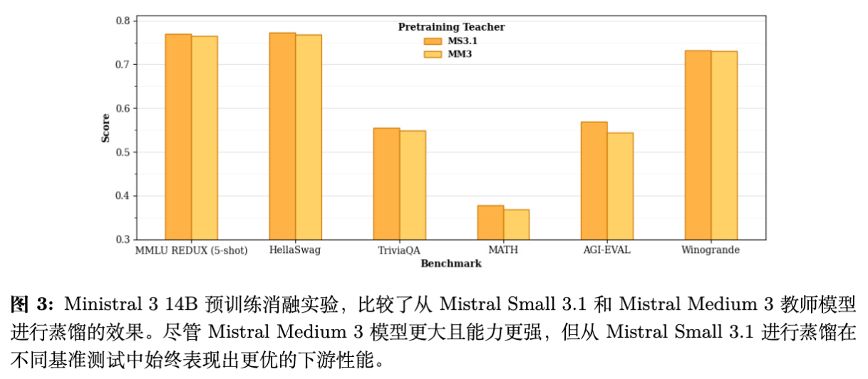 预训练阶段:比较了从 Mistral Small 3.1(24B)蒸馏和从 Mistral Medium 3(更强的大模型)蒸馏的效果。结果显示,使用较弱的 Mistral Small 3.1 作为教师,学生模型的下游任务表现反而更好。 -