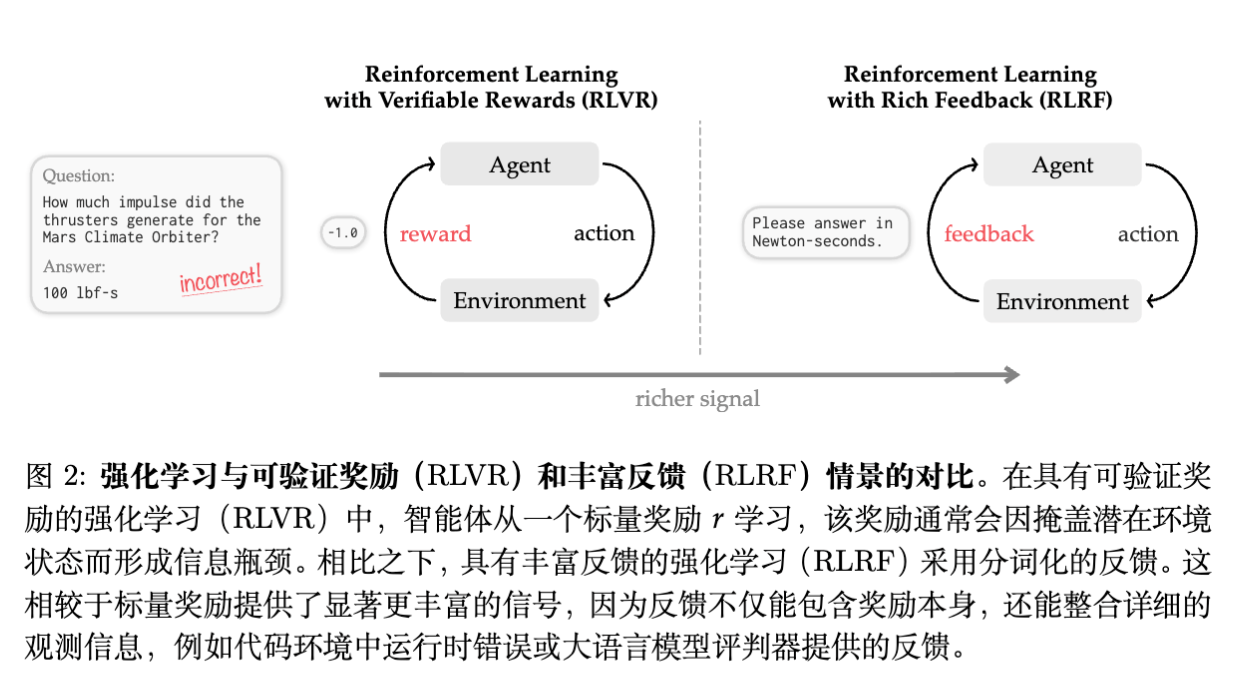 论文提出将问题从 RLVR 扩展为 RLRF (Reinforcement Learning with Rich Feedback) 。在此设定下,环境反馈不仅包含标量奖励,还包含文本化的反馈信息(如错误日志)。