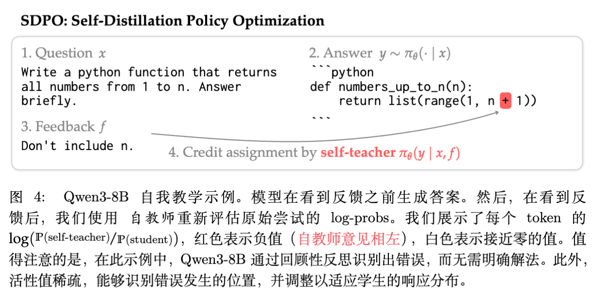 直觉上,模型在看到“报错信息”后,会通过 ICL 能力意识到原本生成的某些 Token 是错误的,从而在 中降低这些 Token 的概率,提升正确 Token 的概率。SDPO 的目标就是让 Student 策略 去逼近这个包含了更多信息的 Teacher 分布。