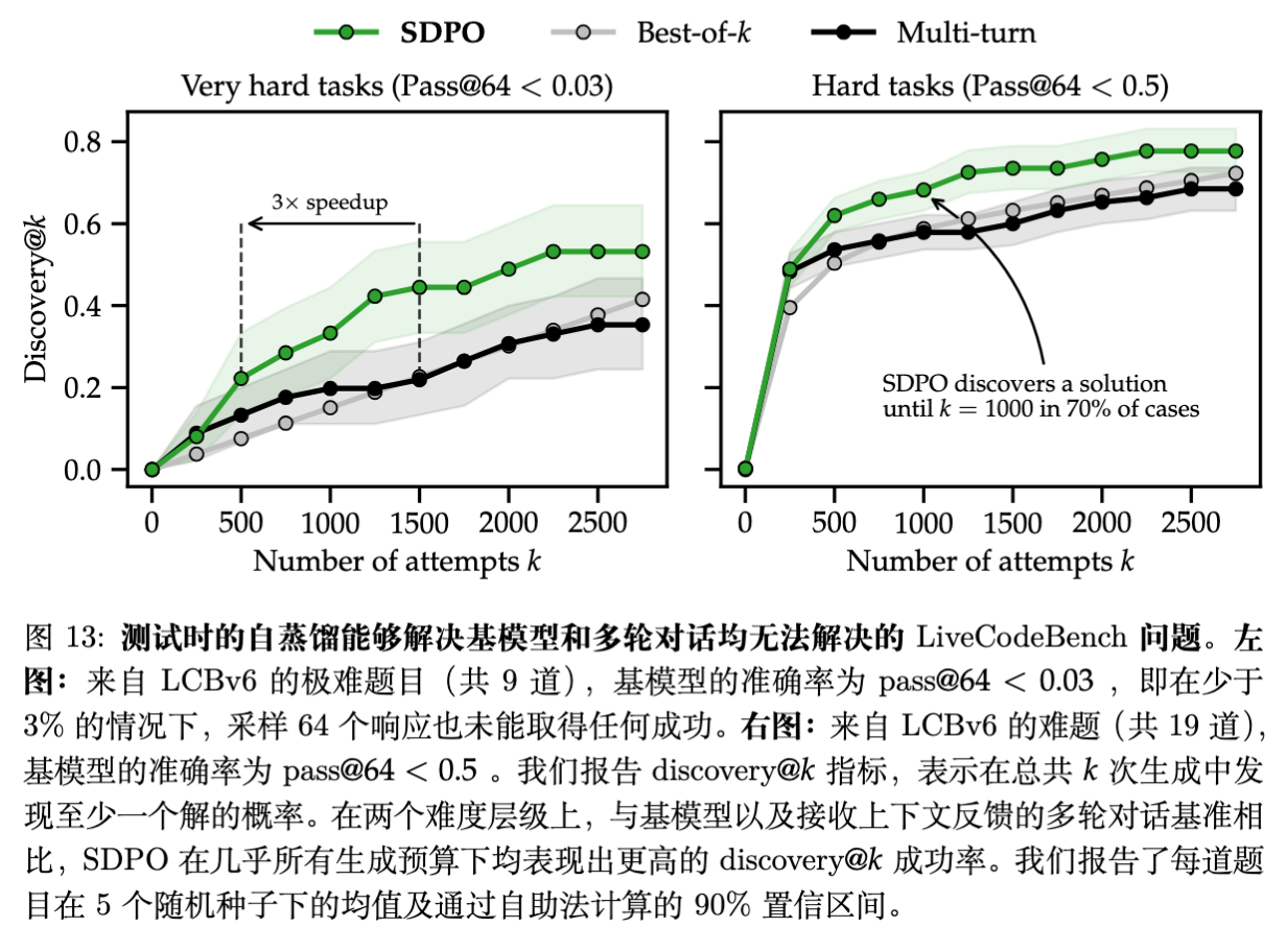 对于极难的问题(Pass@1 接近 0),常规的 Best-of-N 采样或多轮对话(Multi-turn)往往无效。论文提出在测试时,针对单个问题 ,利用 SDPO 进行在线微调。