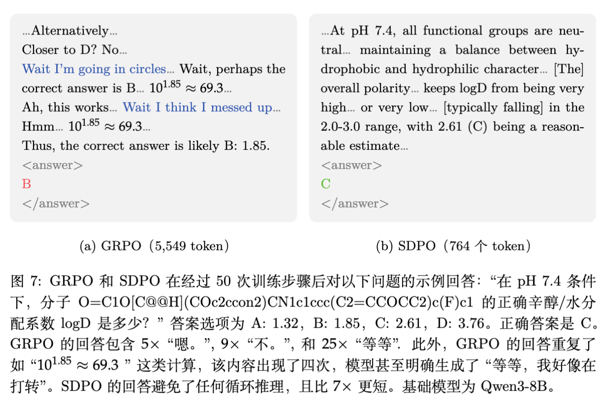 相比之下,SDPO 生成的回复长度平均只有 GRPO 的 1/3,但准确率更高。