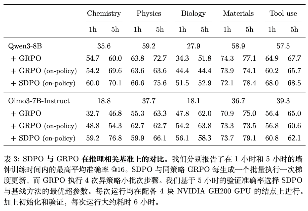结果:SDPO 在 Chemistry 任务上准确率达到 70.1% (Qwen3-8B),显著高于 GRPO 的 60.0%。 -