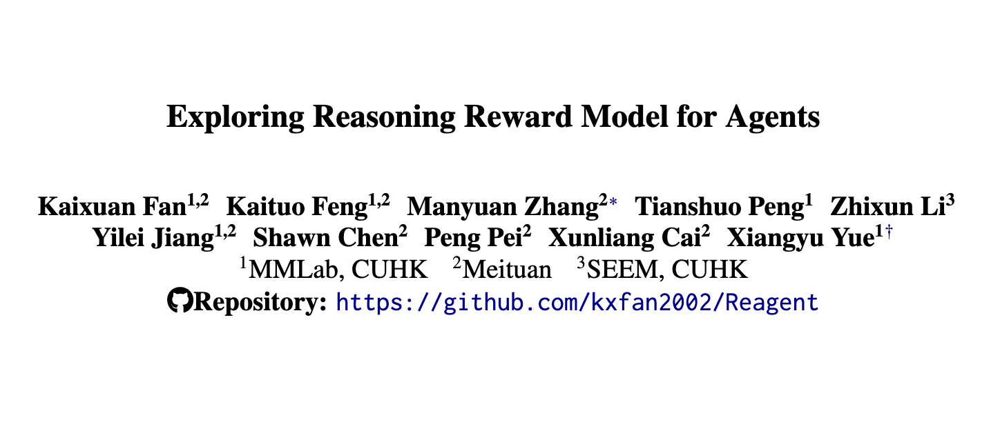 今天解读一篇来自 CUHK 与美团联合发布的论文《Exploring Reasoning Reward Model for Agents》。该研究针对现有 Agentic RL(代理强化学习)中普遍存在的稀疏奖励和二元反馈问题,提出了一种新型的代理推理奖励模型(Agent-RRM)。Agent-RRM 不仅输出标量分数,还提供显式的推理轨迹(Reasoning Trace)和文本批评(Textual Critique)。基于此,作者提出了 Reagent 训练框架,特别是 Reagent-U 策略,将基于规则的奖励、基于模型的标量奖励以及文本批评引导的自我修正机制整合到一个统一的强化学习循环中。在 GAIA、WebWalkerQA 等 12 个基准测试中,该方法取得了显著的性能提升,例如在 GAIA 上达到 43.7% 的准确率。