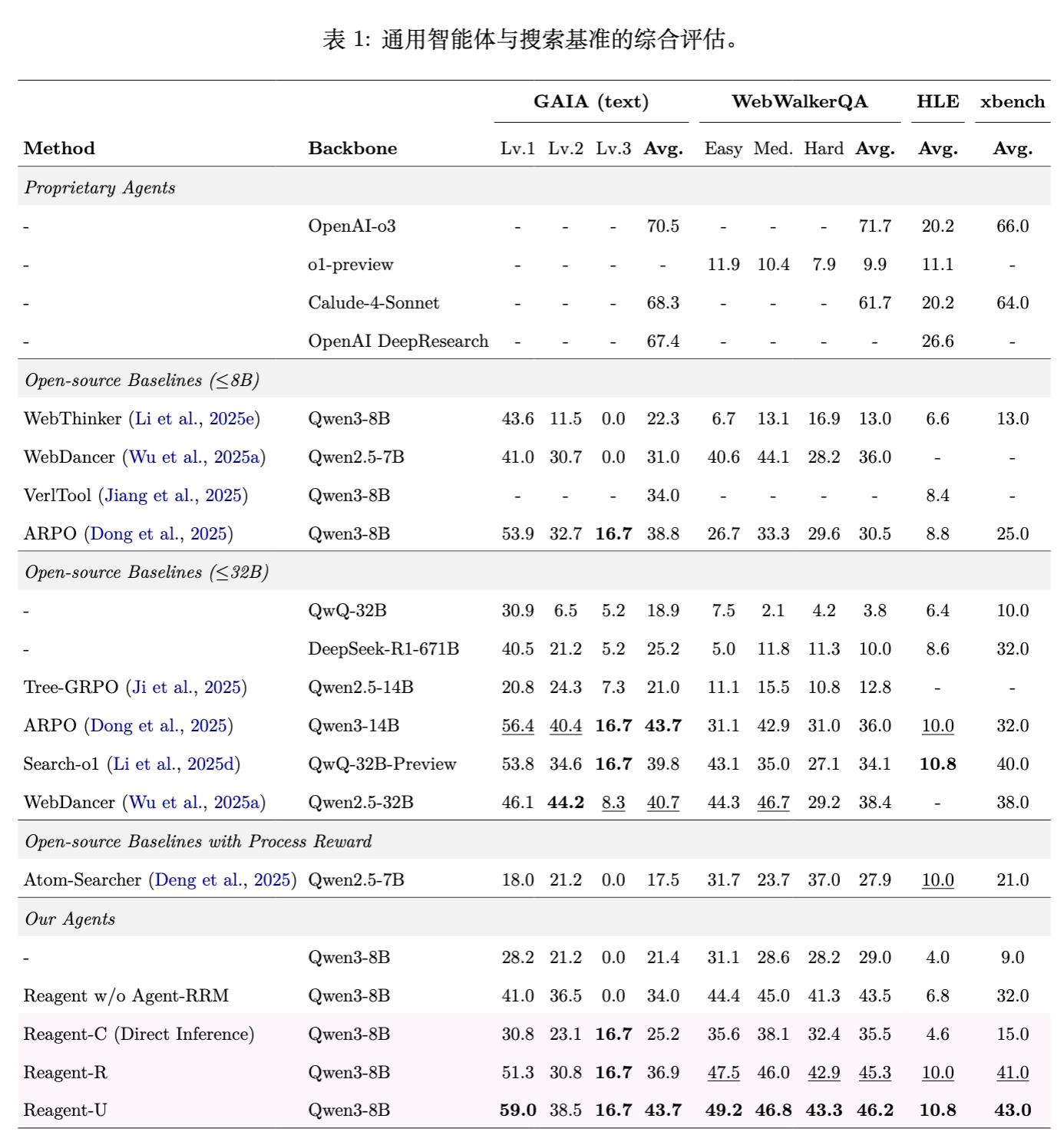 GAIA (text) :Reagent-U 达到 43.7% 的平均准确率,显著优于 Qwen3-8B 基线(21.4%)和 WebThinker(22.3%),甚至超过了参数量更大的 ARPO (Qwen3-14B)。 -