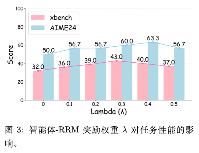 其中, 是基于最终答案正确性的规则奖励(通常为 0 或 1), 是 Agent-RRM 给出的标量分数, 是平衡系数。 -