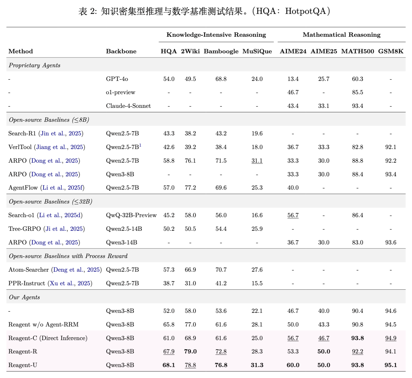 在数学和知识密集型任务上,Reagent-U 同样表现出色,例如在 GSM8K 上达到 95.1%,在 HotpotQA 上达到 68.1%。