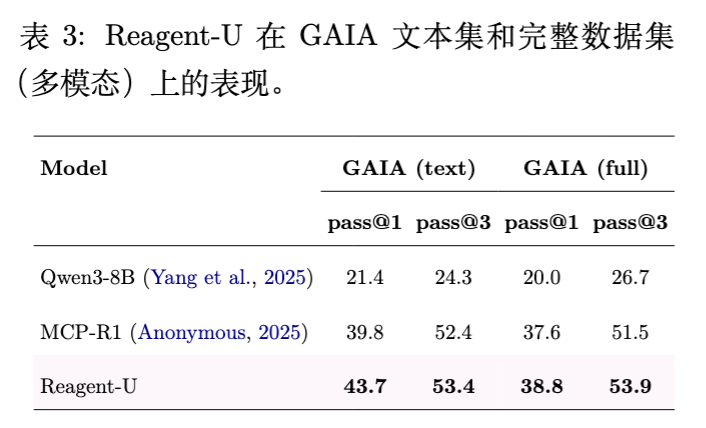 Reagent-U 结合了前两者的优势,实现了性能的进一步飞跃(GAIA 43.7%)。 -