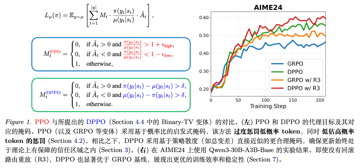 为了解决这一根本性矛盾,作者提出了 DPPO,试图从信任域理论的本源出发,重新构建适合 LLM 的策略优化约束。