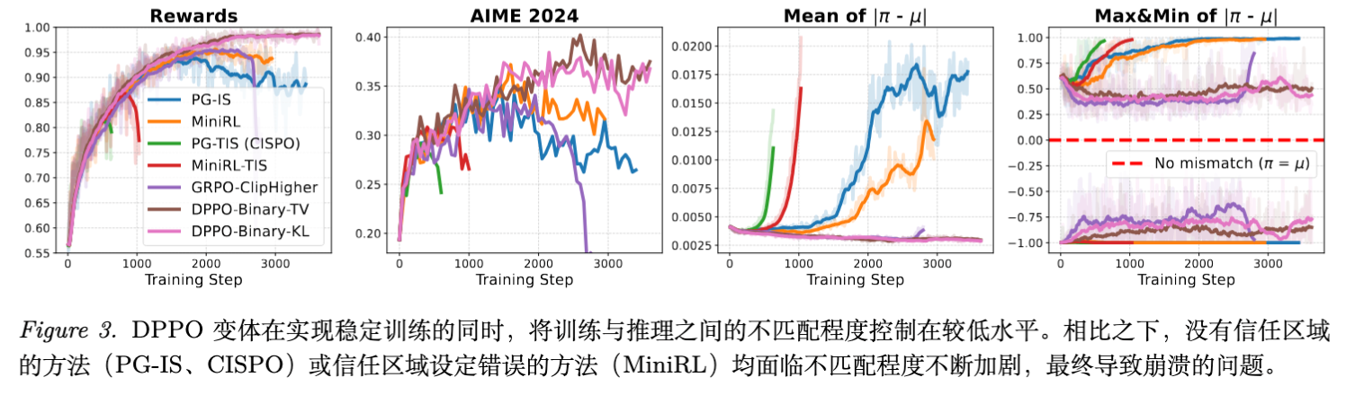 意义:这说明 DPPO 强大的分布约束能力本身就能有效缓解 MoE 特有的训练-推理不匹配问题。当然,叠加 R3 可以进一步微幅提升 DPPO 的表现,说明两者是正交的。