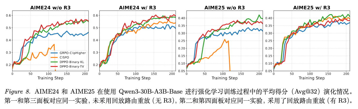 在大规模实验(包括 AIME24/25 数学推理任务)中,DPPO 在不依赖 Rollout Router Replay (R3) 等辅助技术的情况下,展现出了优于 GRPO、Clip-Higher 和 CISPO 等基线的稳定性与收敛效率。