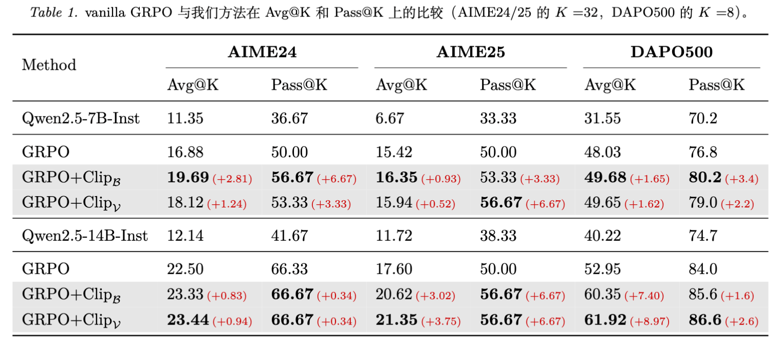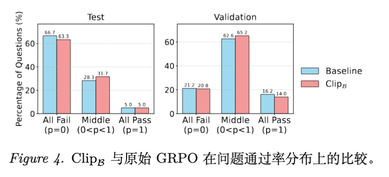 Clip 方法: 中间段通过率的问题比例显著增加。这意味着模型并没有简单地记忆简单题,而是通过保持探索性,尝试解决那些原本无法解决的困难问题。
