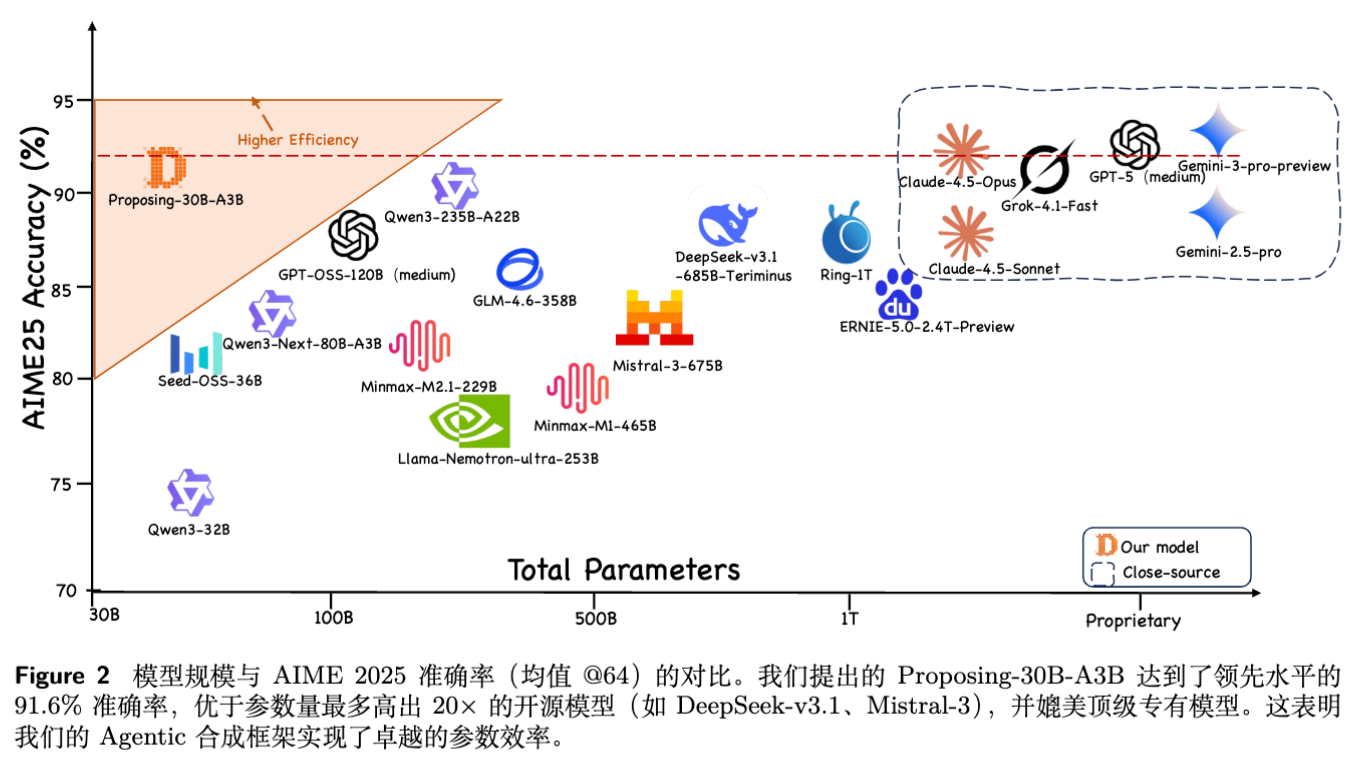 如图 2 所示,Agentic-Proposer-30B 在 AIME 2025 上达到了 91.6% 的准确率。