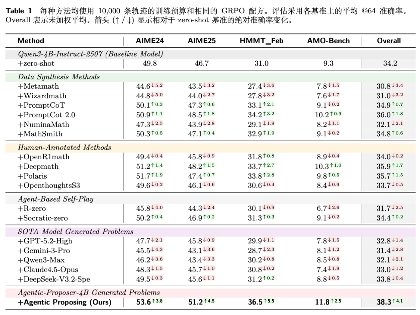 如表 1 所示,在固定数据预算下,使用 Agentic Proposing-4B 生成的数据训练的 4B Solver,在 AIME 2025 上达到了 51.2% 的准确率,相比 Zero-shot 基线(46.7%)提升显著。