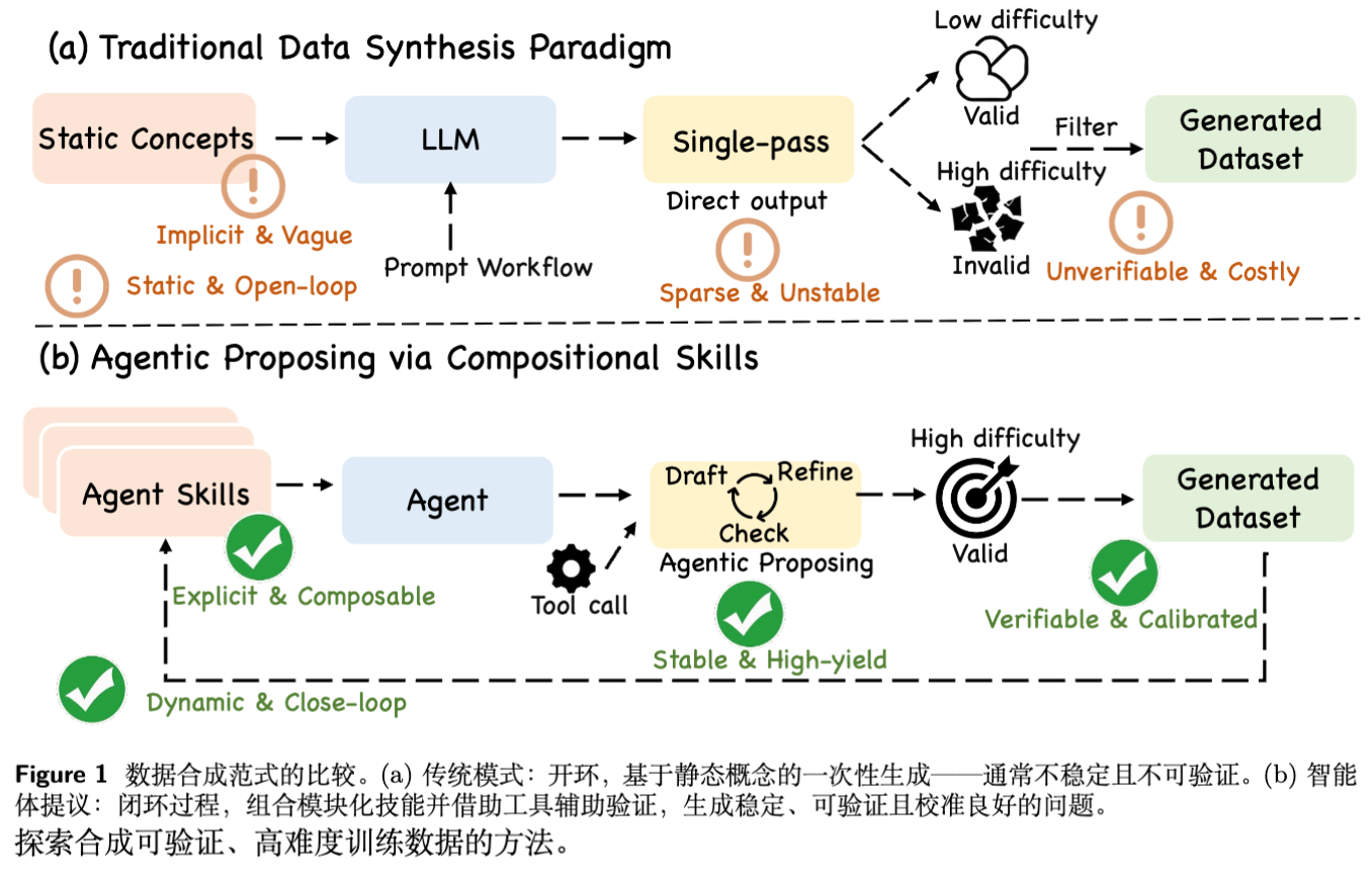 如图 1 所示,对比了传统合成范式与 Agentic Proposing 的区别。