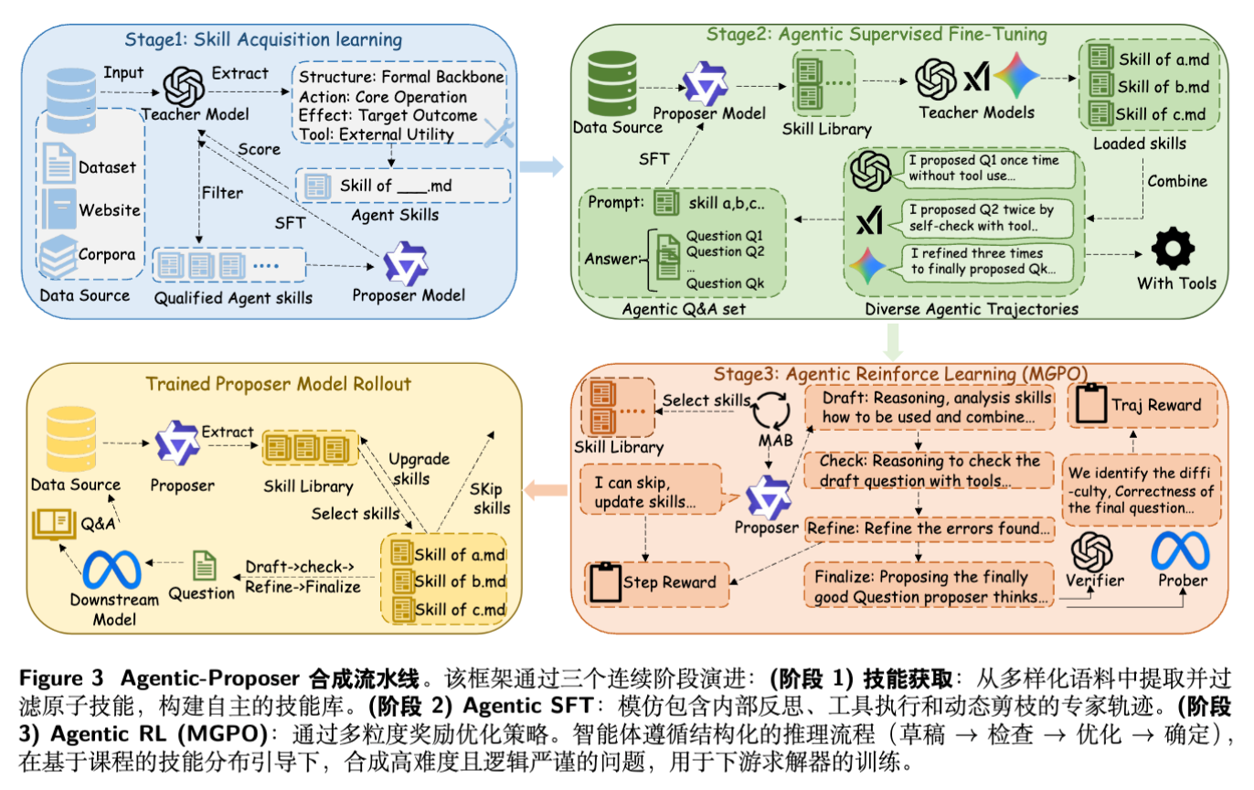 整个流程如图 3 所示,分为三个阶段:技能获取、Agentic SFT、Agentic RL (MGPO)。