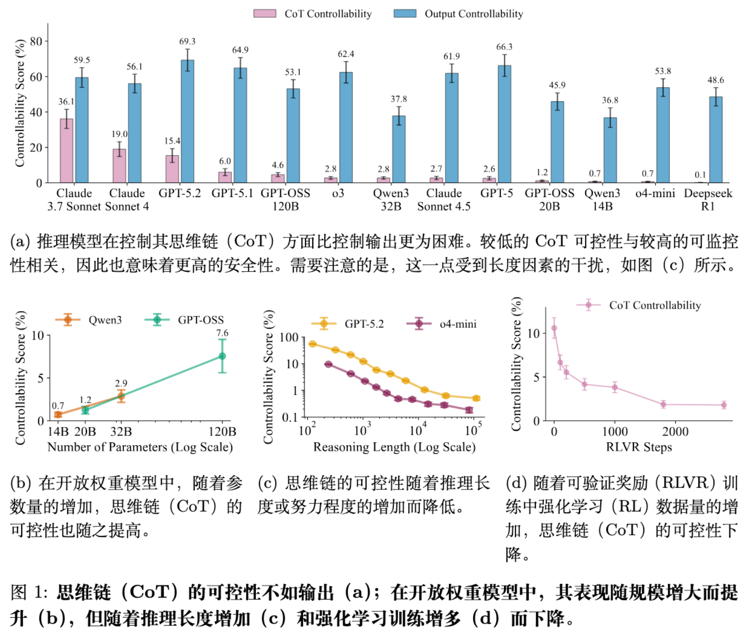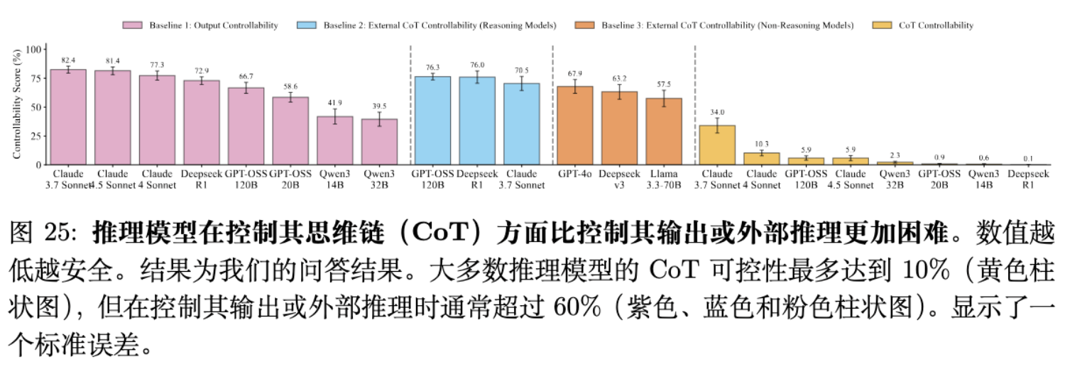 目前推理模型较低的思维链可控性为“思维链监控(CoT Monitoring)”作为一种对齐与监督机制提供了可行性依据。