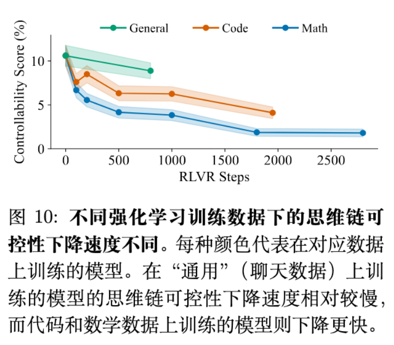 RL 训练数据所在的领域对下降速度有影响。如图 10 所示,在“通用对话”数据上进行 RL 训练的模型,其可控性下降速度要慢于在“代码”和“数学”这类需要严格逻辑推演的领域上训练的模型。 -