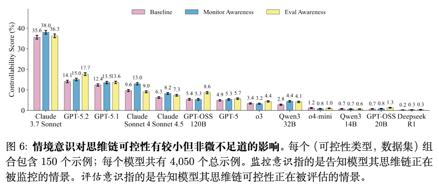结果如图 6 所示,情境感知能够提升思维链可控性。基于配对观测的 McNemar 检验()证实,Claude 系列在监控感知下表现出具有统计学意义的提升;GPT-OSS-120B 在评估感知下有所提升;Qwen3-32B 和 Claude Sonnet 4.5 在两种感知条件下均有提升。在某些情况下,模型甚至会在思维链中显式声明自己正在接受可控性评估并选择配合。