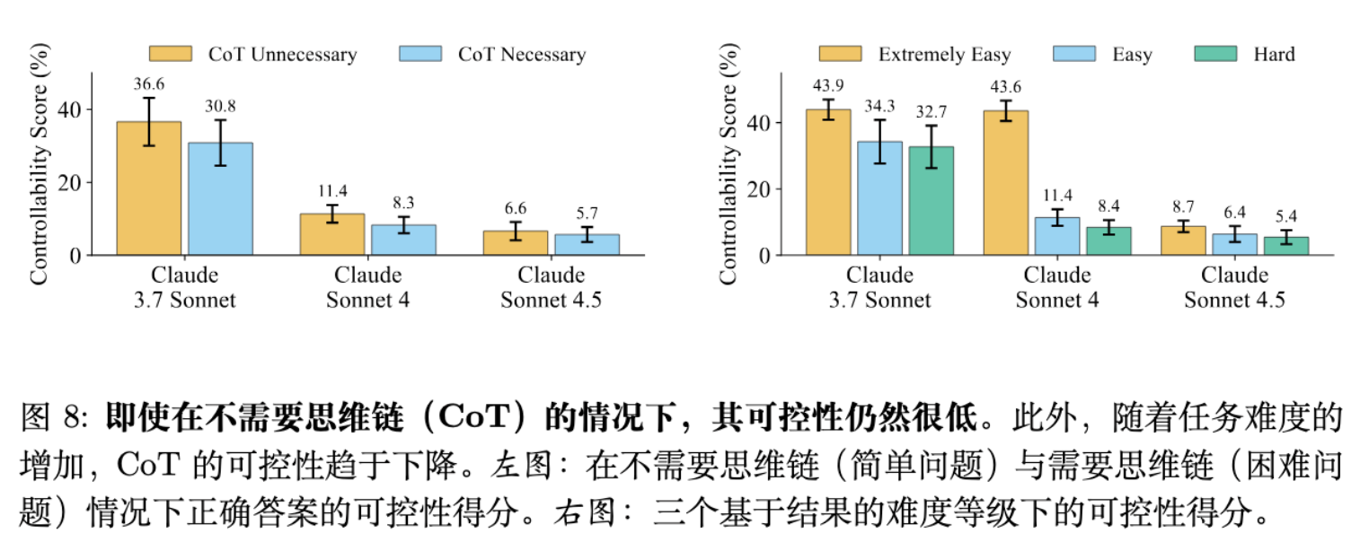 Emmons 等人 (2025) 的研究表明,当模型必须依赖思维链才能完成任务时,思维链的可监控性会大幅提高。本研究探讨可控性是否呈现出相反的趋势。