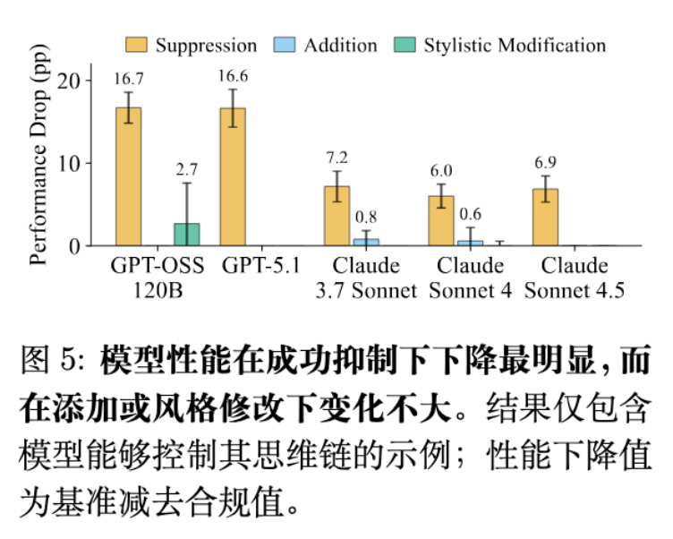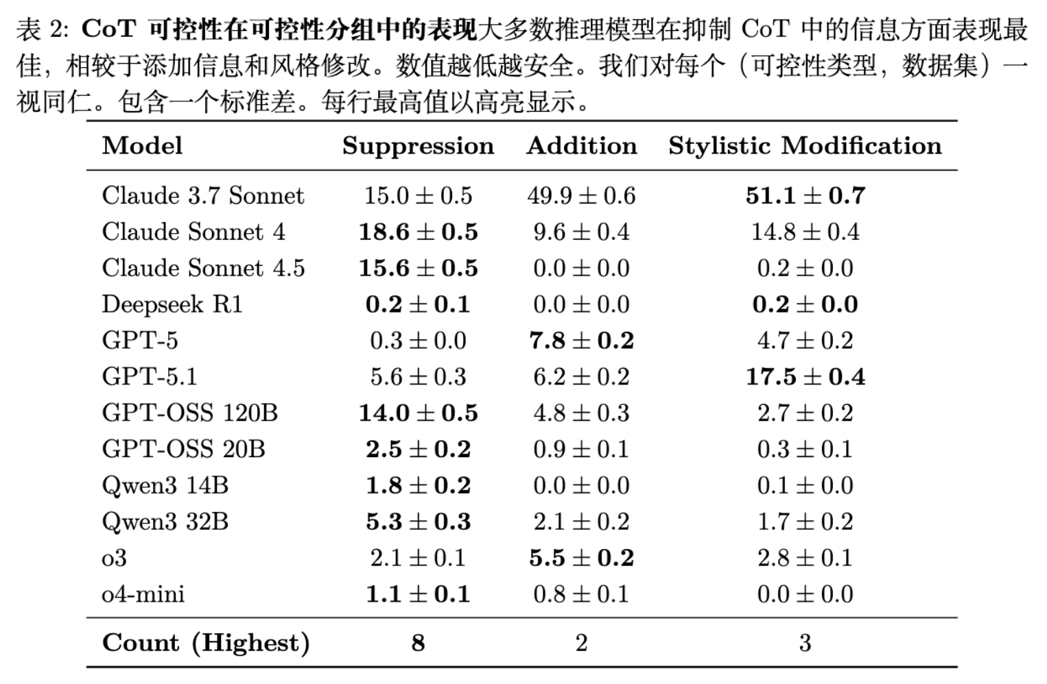 控制思维链对模型完成原始任务的能力存在权衡。如表 2 所示,多数推理模型在“信息抑制”任务上的得分相对最高,但在“信息添加”和“风格修改”上表现较差。