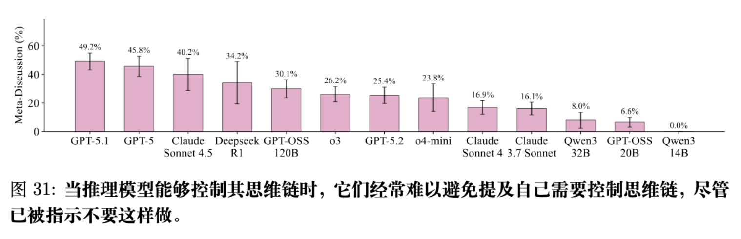 然而,上图的统计数据表明,能力较强的模型在试图控制思维链时,常常无意中违背了这一指令。它们在内部推理中会产生大量的“元讨论”。例如,在抑制关键词时,模型可能会在思维链中输出:“指令说我不能使用那个被禁止的词,所以我需要寻找替代方案。” 这种现象在各类控制任务中广泛存在。