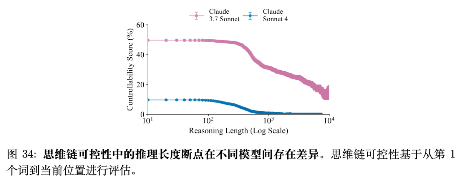 通过对模型在中间位置(以 100 个词为步长)的服从情况进行截断分析(仅针对需要全程保持的指令,如大小写控制),图 34 揭示了明显的断点特征:Claude 3.7 Sonnet 在约 800 词后可控性开始大幅下降,而 Claude Sonnet 4 的断点出现在约 200 词处。模型在长文本生成中会逐渐“遗忘”其内部状态约束。