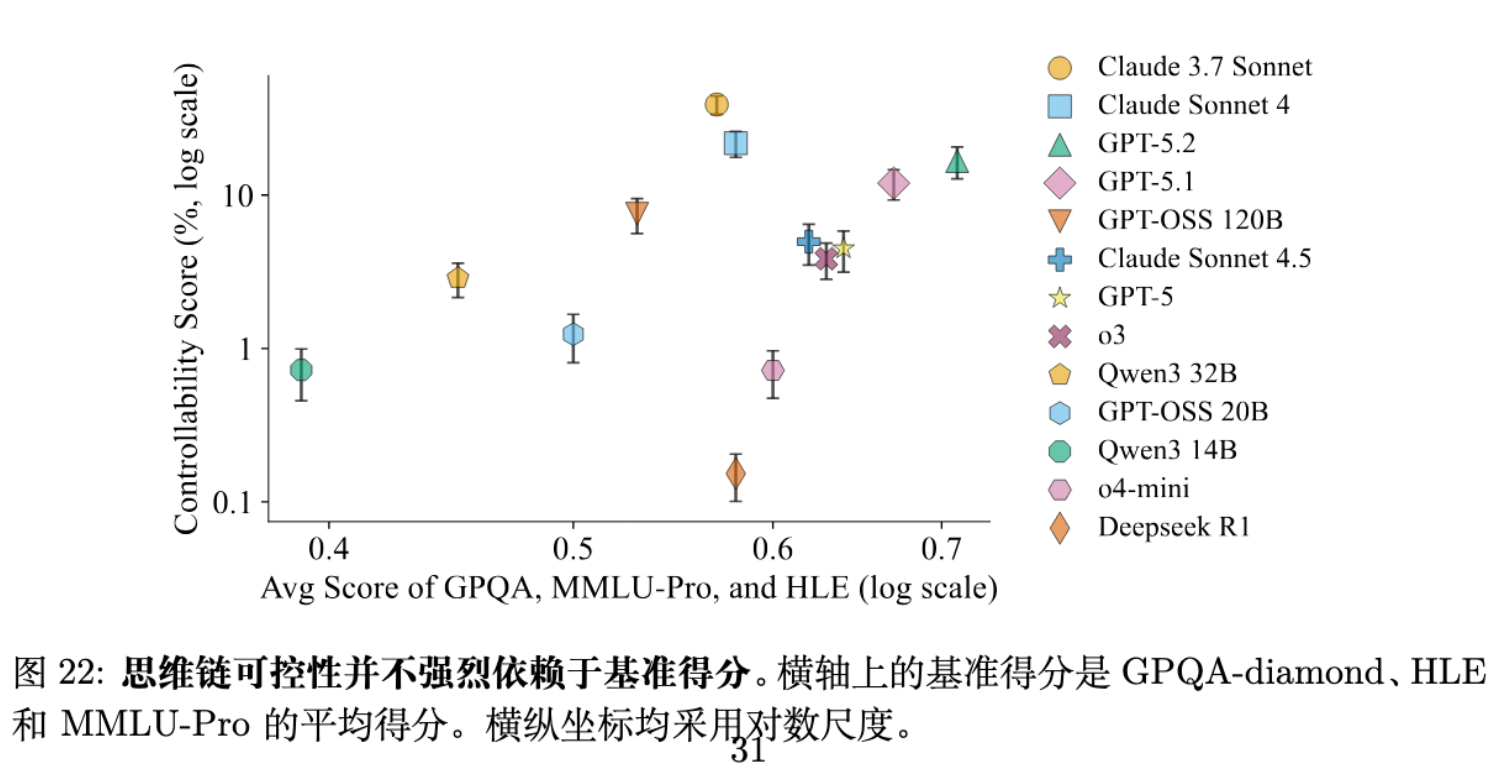 这反映出,随着模型拟合能力与指令遵循能力的整体提升,其渗透并控制隐藏推理过程的能力也在对数尺度上增长。然而,如上图所示,思维链可控性与模型在常规基准测试(如 GPQA, HLE)上的综合得分并没有直接的强相关性。