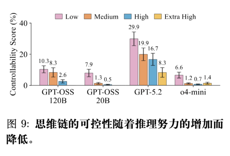 GPT-OSS-120B 的思维链可控性为 5.9%,而同系列的 20B 版本仅为 0.9%。 -