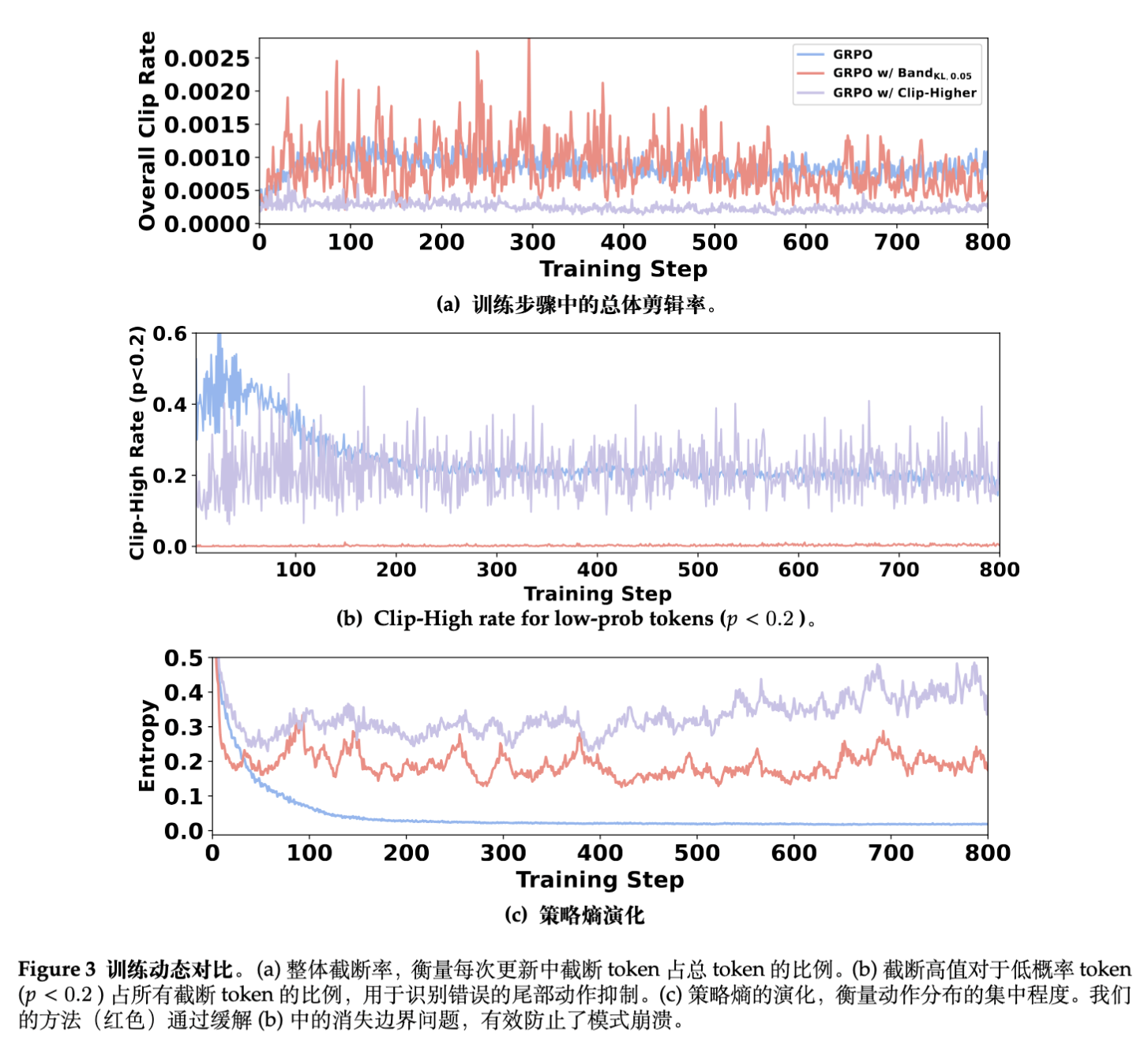 GRPO w/ Clip-Higher: 采用不对称启发式裁剪,作为当前最优的基线( 或其他设定)。 -