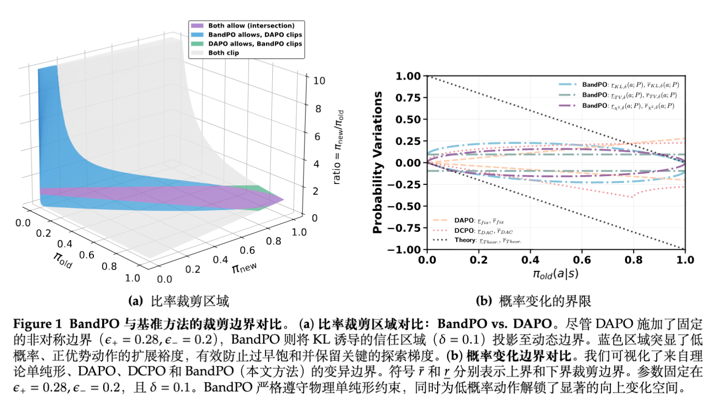 观察图1a可知,BandPO在低概率区允许极大的放宽,但在高概率区(),基于散度几何算出的理论边界比固定边界(如DAPO的 )还要严格。
