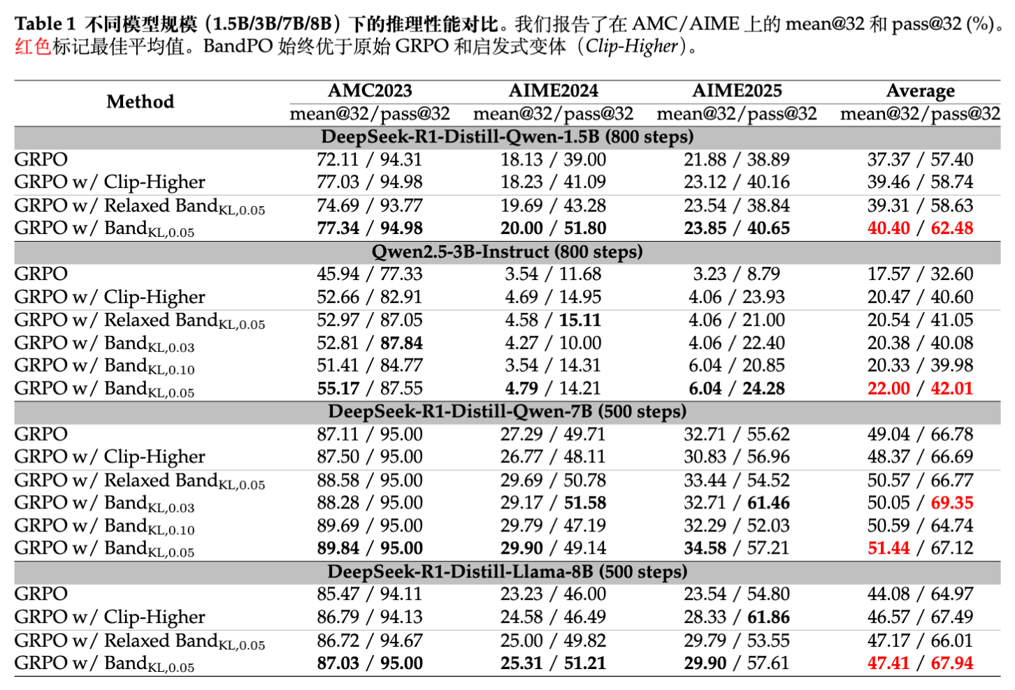 GRPO w/ BandPO(本文方法):采用Band算子并固定信赖域参数 。