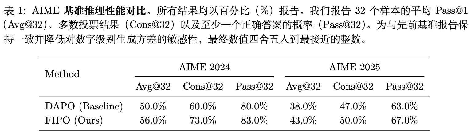小批量大小 (Mini-Batch Size) :DAPO 默认设置为 32,但作者观察到增加该数值能提升训练稳定性,因此 FIPO 采用 64(包含 8 次梯度更新/迭代)。 -