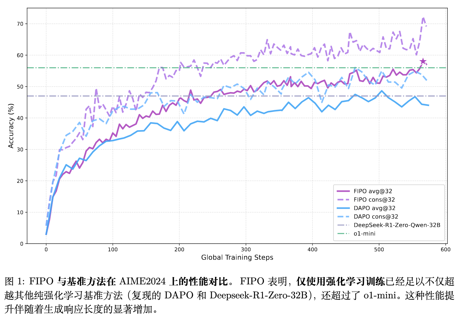 (注:图 1 直观展示了随全局训练步数增加,FIPO 的性能曲线稳步上扬并突破了 DAPO 遭遇的平台期,且这种性能收益伴随着生成长度的大幅增加。)