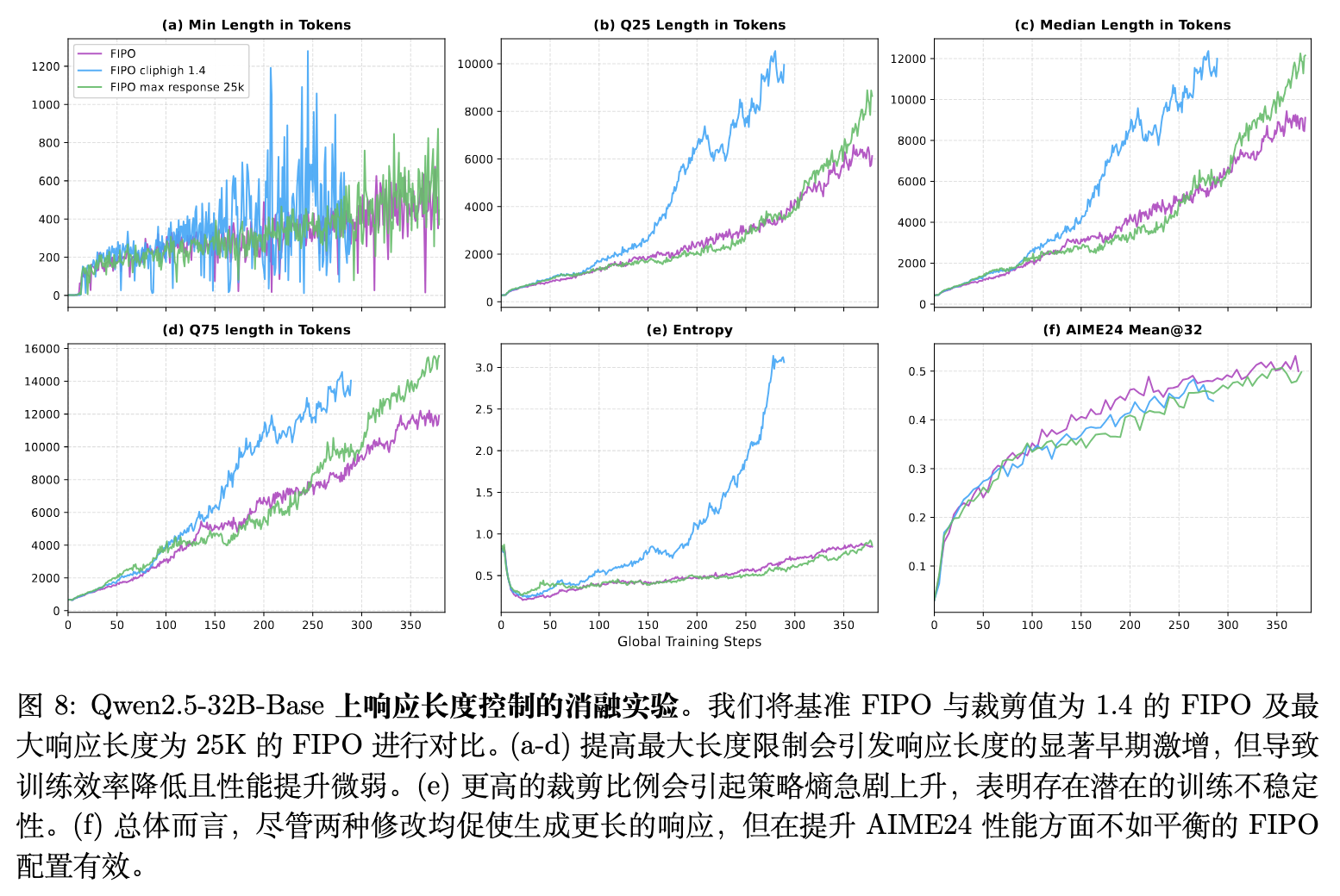最关键的是,这种未受破坏的优化动能确保了 FIPO 设计中的远距离前瞻性探索信号(Future KL)能够被成功且平滑地向后传播,并未被截断机制人为阻断。从而避免了模型回退至提前终结的短文本舒适区。