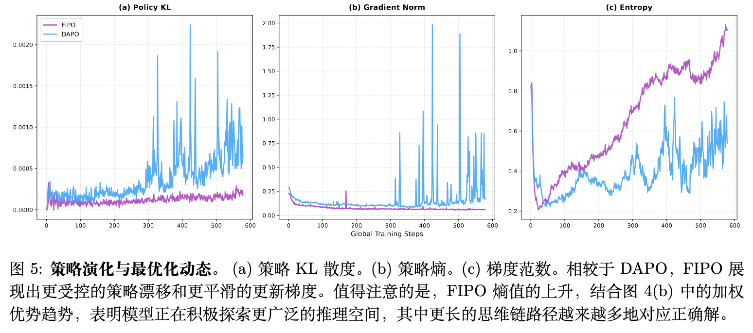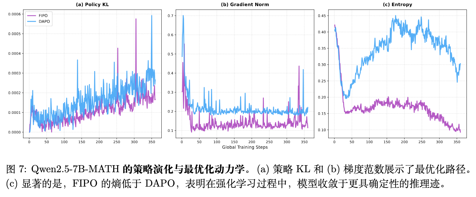 梯度范数 (Gradient Norm) :FIPO 的梯度范数在整个训练过程中维持在一致且较低的水平,反映了细粒度更新带来的平滑性。相比之下,DAPO 显示出高波动性和剧烈的突增,表明其搜索过程存在突发转向的风险。 -