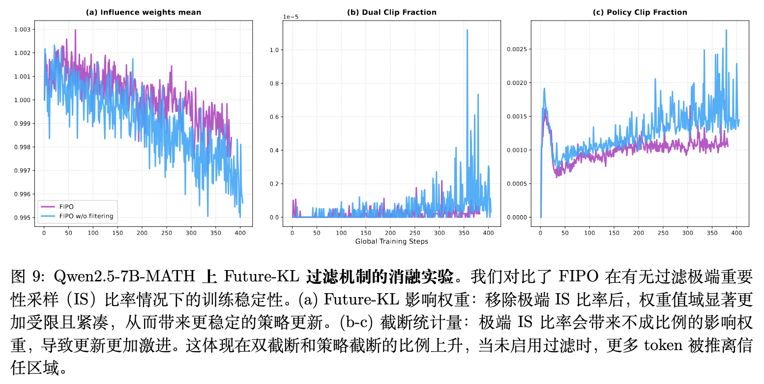 实验数据表明,移除极端 IS 比率过滤机制会导致性能回退至未优化的基线水平(从 40.0% 降至 38.0%)。图 9 的动态图显示,移除过滤后,Future-KL 的影响力权重范围被极大地拉宽,导致更高频率的激进策略更新。这直接表现为 Dual-Clip 和 Policy-Clip 截断比例急剧上升,更多词元被强行推离安全信任区,使得模型经常尝试突破目标限制,进而导致了次优的性能表现。
