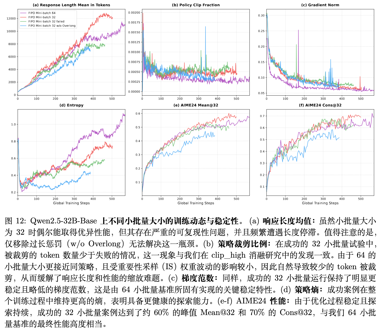 在实践 FIPO 的过程中,论文也坦陈了探索过程中的一些曲折,并着重探讨了小批量(Mini-batch Size)对模型收敛稳定性的深刻影响。