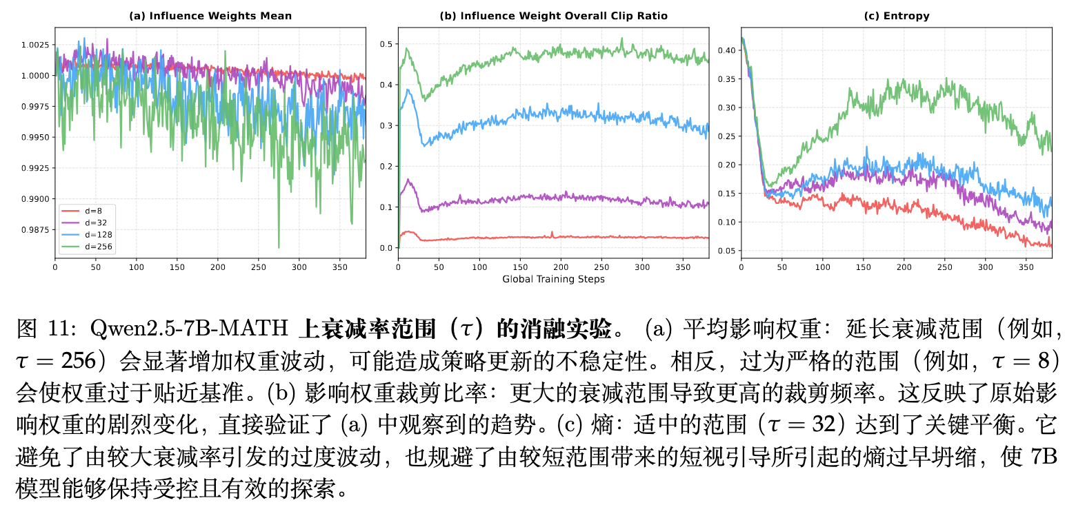 衰减率参数化为 ,其中 是控制未来监督有效视界(或“半衰期”)的超参数。该设置确保了信用分配集中在紧邻的推理链上,为远距离且高度不确定的词元分配较低的权重。
