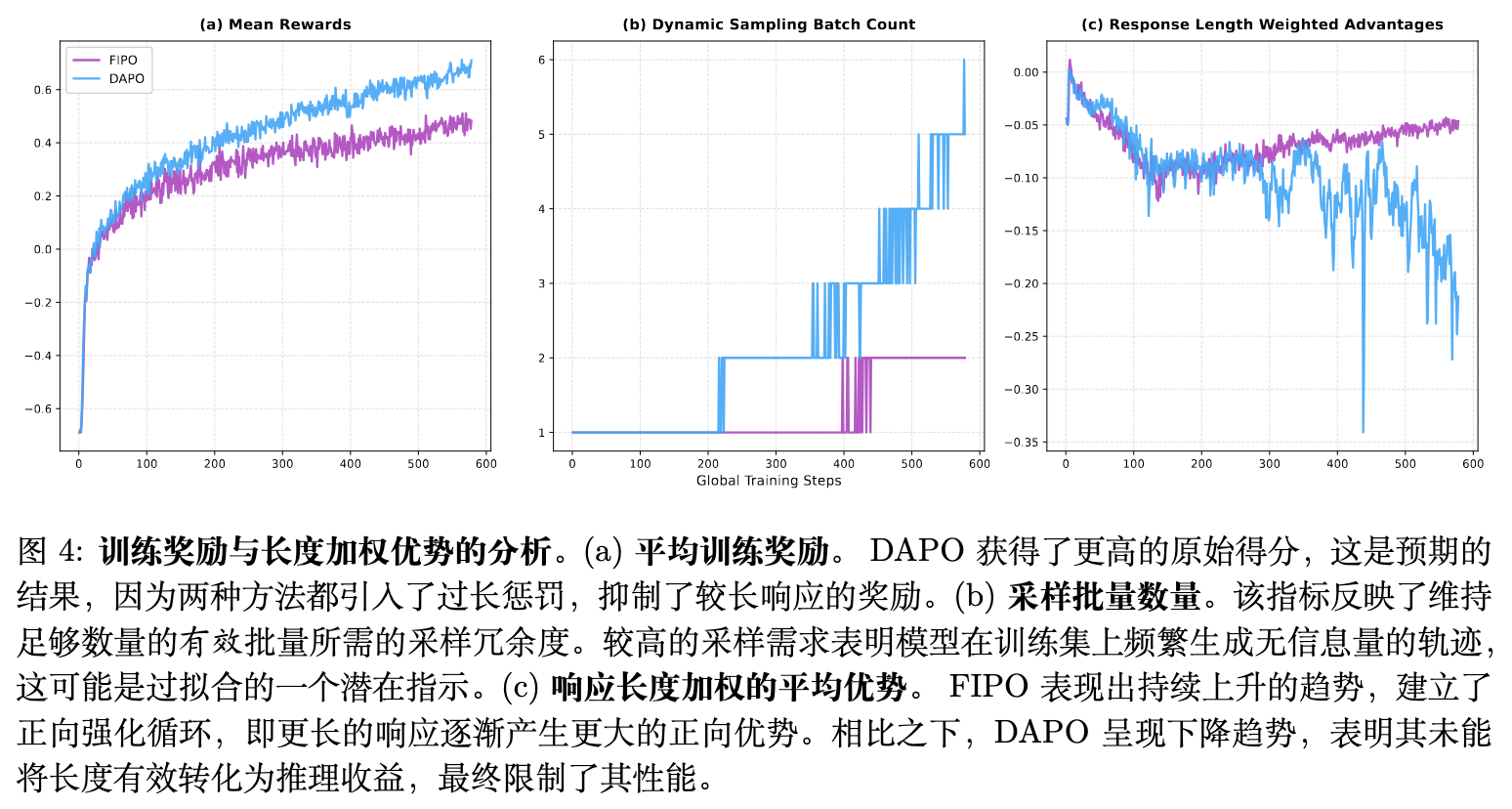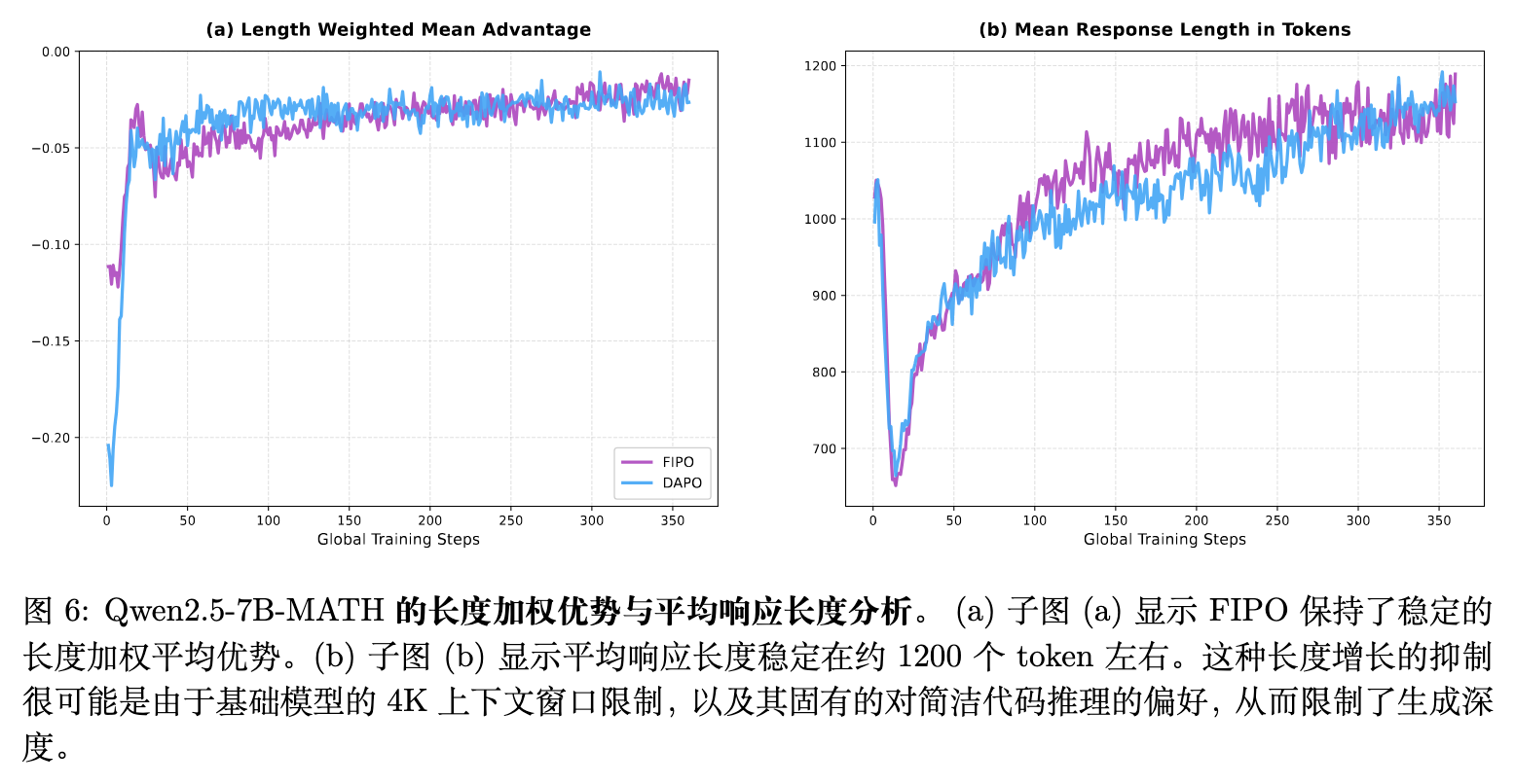 奖励陷阱与过度拟合:图 4(a) 显示,DAPO 在训练中持续保持着比 FIPO 更高的平均奖励。论文认为,这是奖励函数设定的数值表象而非性能优越的体现。由于奖励包含过长惩罚,FIPO 构建的复杂长推理自然受到抑制。DAPO 为了最大化直接奖励,倾向于生成短回复以规避惩罚,这使得其收敛到了一个受限搜索空间内的局部最优解。 -