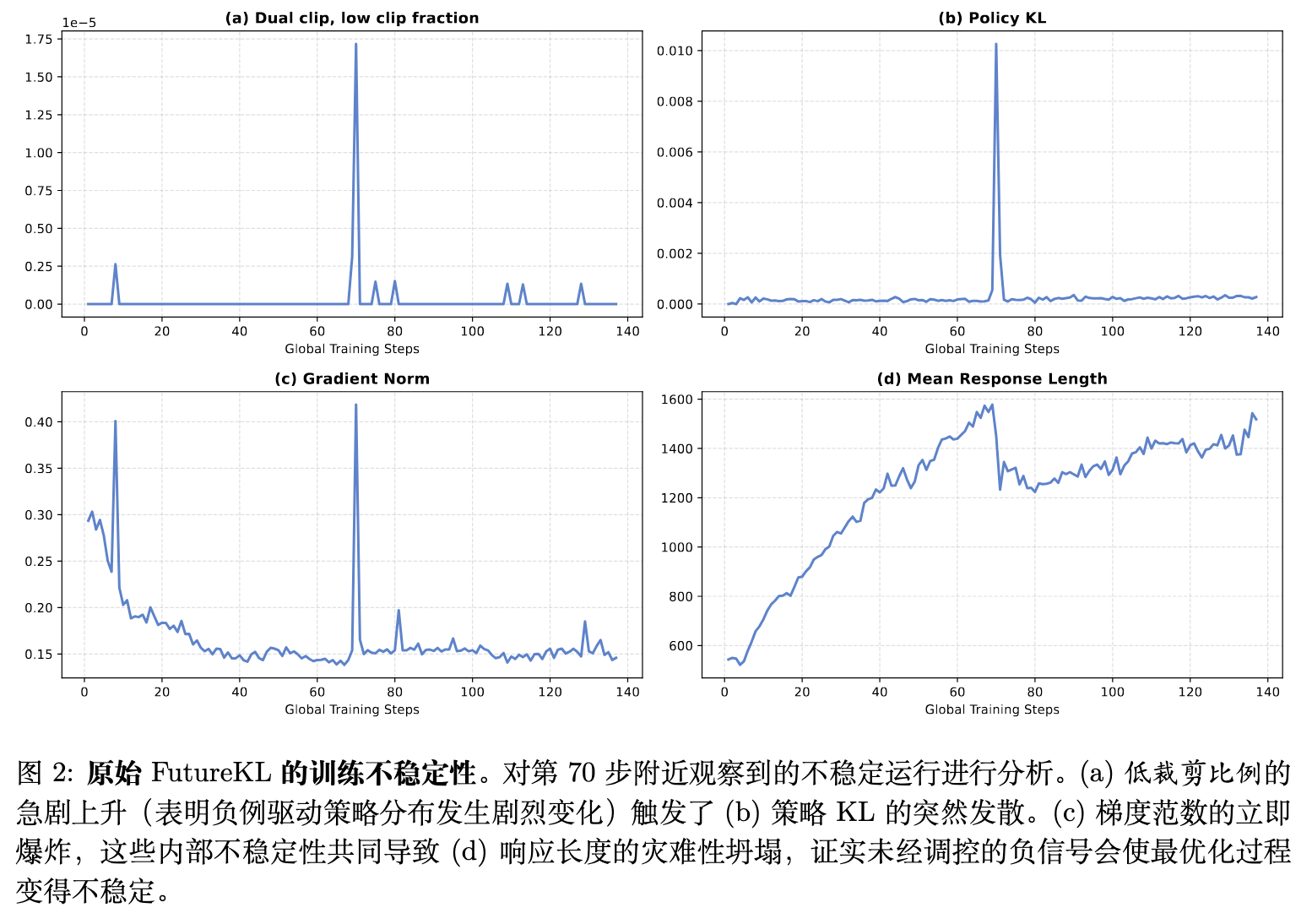 (注:图 2 展示了没有保护机制时,模型在第 70 步左右发生崩溃,负样本上的低裁剪比例急剧增加,随后出现策略 KL 散度的爆发、梯度范数飙升以及响应长度的灾难性下降。)