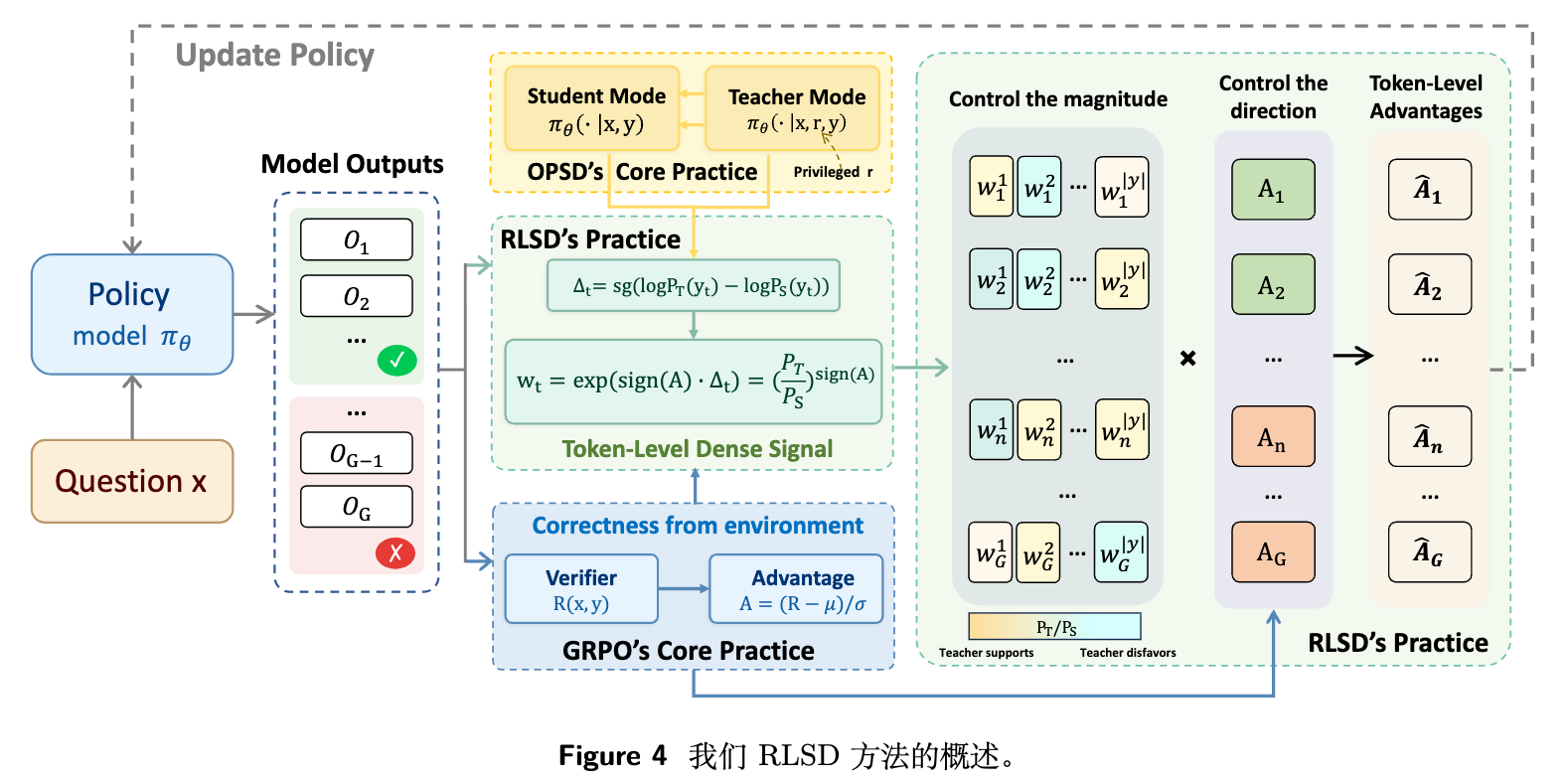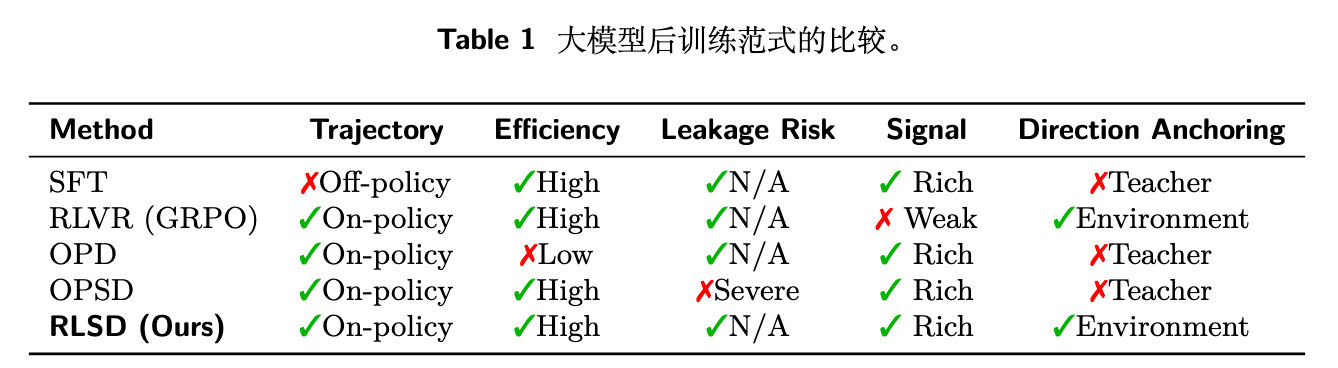 提出了 RLSD(RLVR with Self-Distillation)框架,改变了教师信号的使用方式——从“分布匹配的生成目标”转变为“策略梯度中的幅度评估器”。 -
