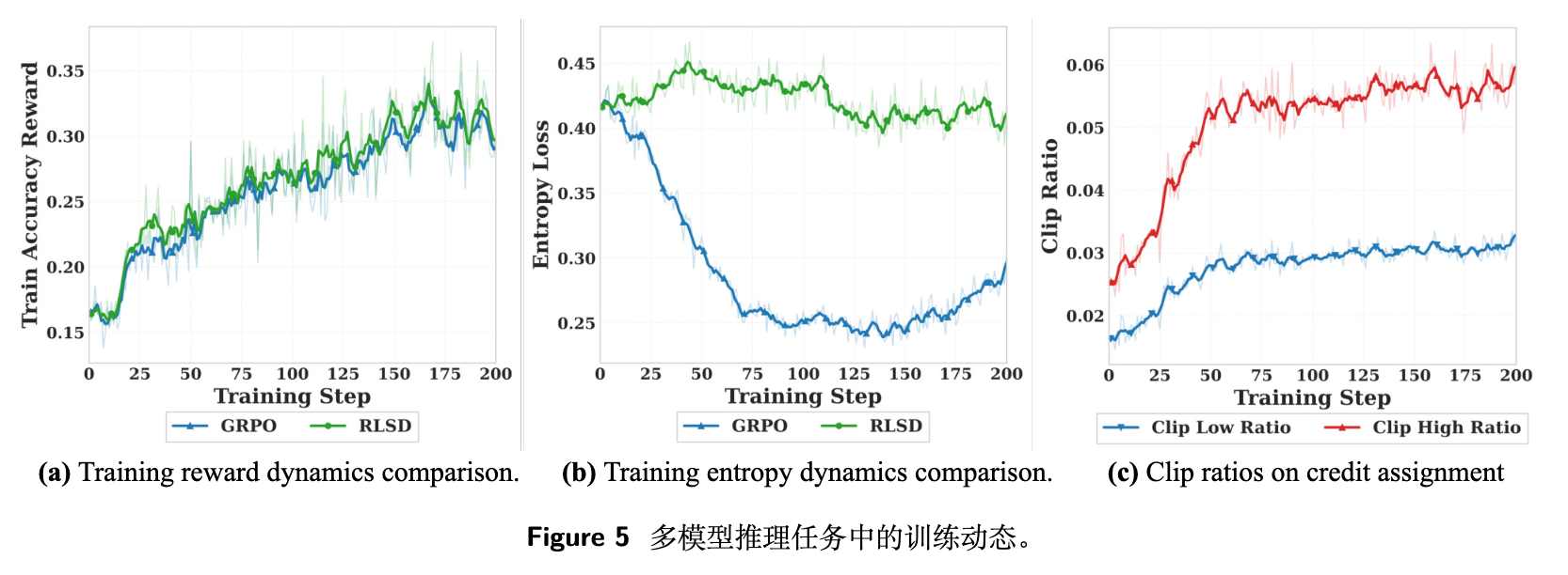 熵的变化:由于 GRPO 的序列级同质化惩罚,模型的生成熵坍塌得较快。而 RLSD 通过精确选择性地增强关键推理 Token,避免了所有位置的无差别抑制,从而维持了更健康的熵水平,有助于更好的探索。 -