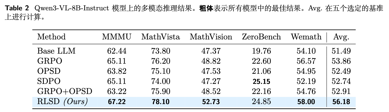 RLSD 在各项多模态基准测试中达到了较高的平均准确率。相较于仅使用 GRPO,RLSD 表现出显著的性能提升,尤其是在 MathVista 和 MathVision 等对细粒度推理步骤要求较高的数学测试集中。与 OPSD 和 SDPO 等自蒸馏基线相比,RLSD 避免了特权信息的泄漏与退化,展现出了更为鲁棒的推理性能。