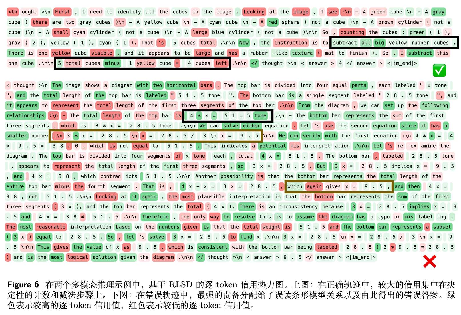 在一个预测正确的立方体计数任务中,RLSD 赋予了关键识别操作和最终减法步骤最大的奖励权重,而弱化了“看图可知”这类模版化表述的权重。 -