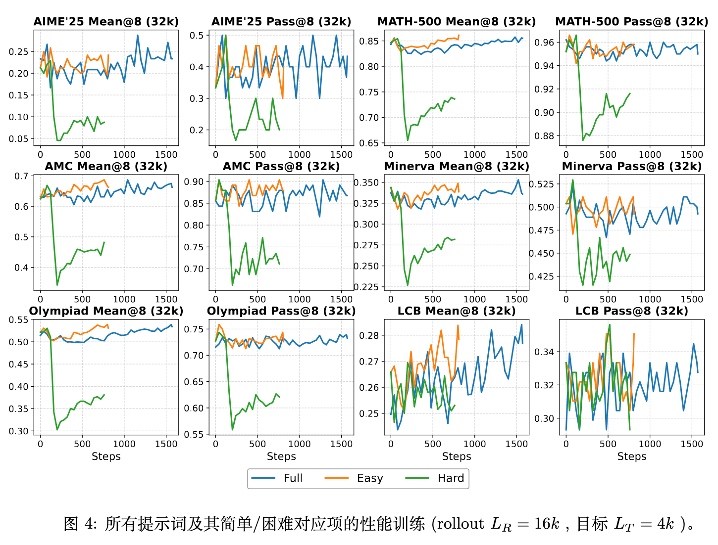训练数据中提示词的难度在决定正向奖励信号密度方面起着关键作用。为了进行对比,研究基于 轨迹的初始通过率(pass rate),将 DeepScaleR 提示词划分为两组子集:DeepScaleR-Easy(通过率 )和 DeepScaleR-Hard(通过率 )。