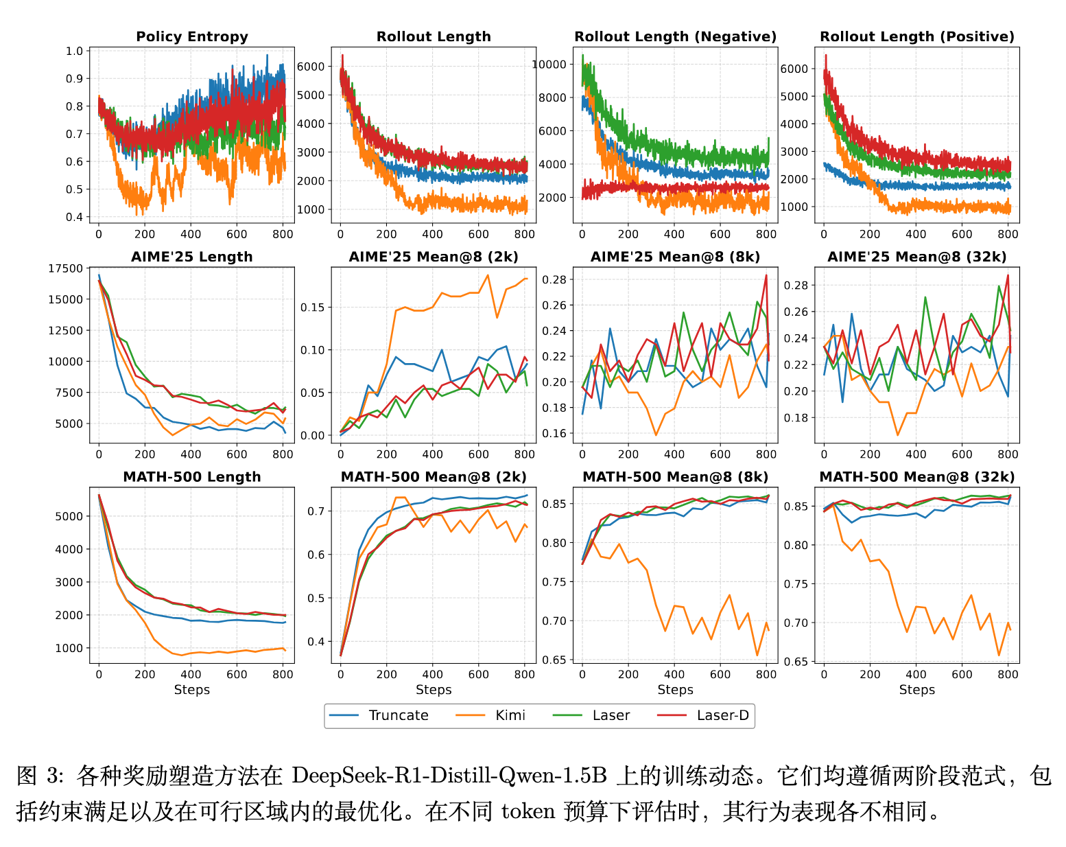 除了截断策略,研究还对比了其他文献中提出的奖励函数变体,包括 Kimi-1.5 的策略和 Laser 策略,这些变体的数学定义在后文有详细展开。