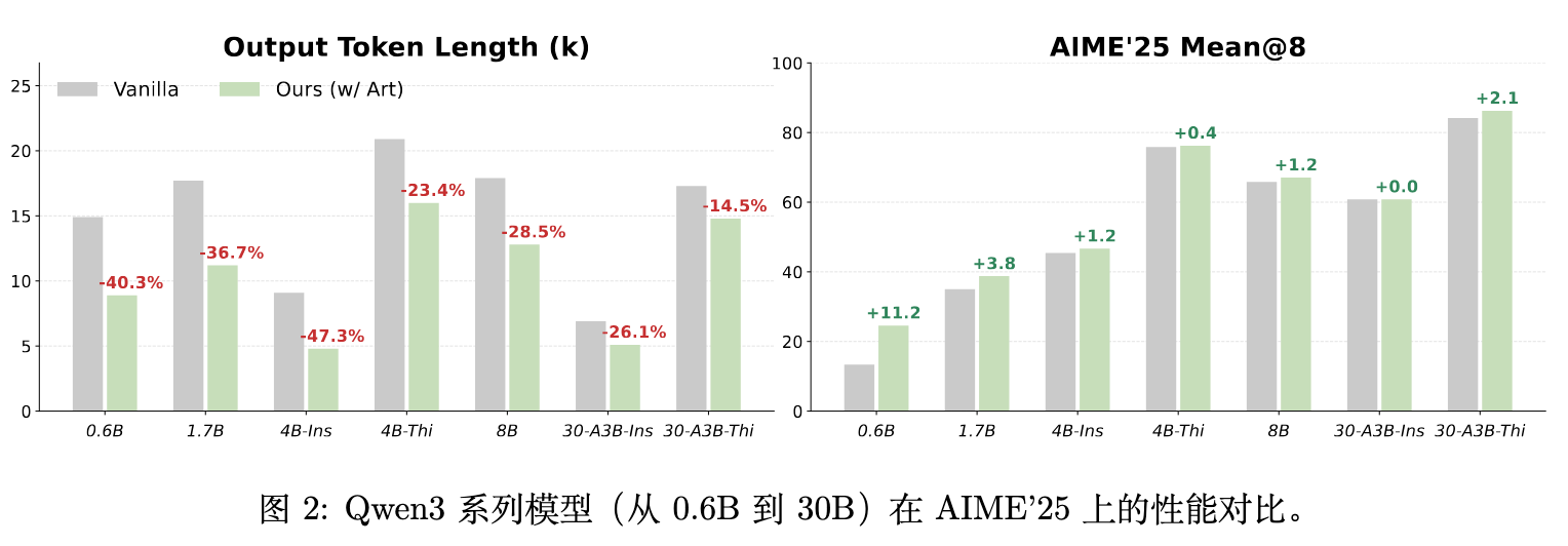 跨域与跨规模的泛化性:模型在纯数学领域学到的“剔除过渡句、直接组织形式化逻辑”的长度压缩偏好,能够泛化至代码生成(如 LiveCodeBench)等其他领域,并在 0.6B 到 30B 的多尺度模型上得到验证。