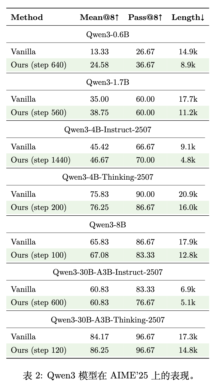 结果表明,该训练配方在不同模型规模上均具备鲁棒性。以 Qwen3-0.6B 为例,经过 640 步优化后,其在 AIME'25 测试集上的 Mean@8 指标从 13.33 提升至 24.58,同时平均响应长度从 14.9k 大幅压缩至 8.9k。对于规模较大的 Qwen3-30B-A3B-Thinking-2507 模型,在经过仅仅 120 步优化后,Mean@8 从 84.17 提升至 86.25,平均长度从 17.3k 压缩至 14.8k。整体而言,长度压缩比例介于 15% 到 47.3% 之间,并在保证准确率的同时,实现了整体性能-开销曲线的优化。