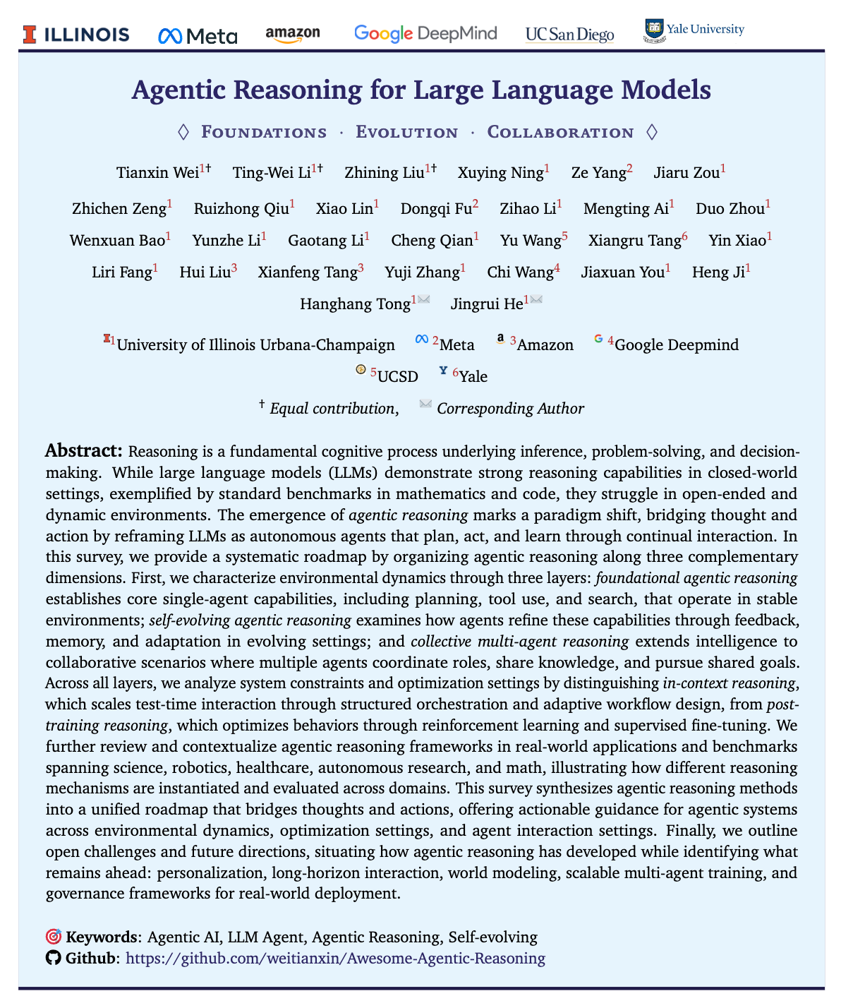 论文标题:Agentic Reasoning for Large Language Models: Foundations, Evolution, Co